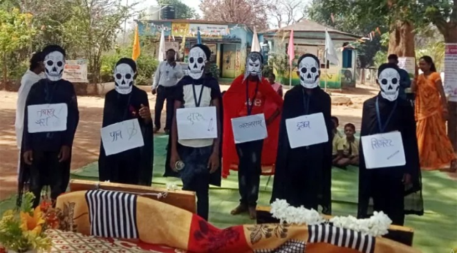 कार्यक्रम का मुख्य आकर्षण छात्रों द्वारा प्रस्तुत किया गया पथनाट्य रहा, जिसने सभी का ध्यान अपनी ओर खींचा। छात्रों ने काले कपड़े पहनकर और मुखौटे लगाकर विभिन्न प्रकार के नशों को ‘यमदूत’ के रूप में प्रस्तुत किया। उनके हाथों में तंबाकू, गुटखा, शराब, सिगरेट और ड्रग्स जैसे नशों के नाम वाले फलक थे। इस प्रभावशाली प्रस्तुति के जरिए “व्यसन मृत्यु का द्वार है” यह संदेश बेहद सशक्त तरीके से दिया गया। केवल किताबों तक सीमित रहने के बजाय जब छात्रों ने इस विषय को दृश्य रूप में देखा, तो इसका गहरा असर उन पर पड़ा। इसके बाद छात्रों ने गांव में रैली निकालकर लोगों को जागरूक किया और नशामुक्त समाज बनाने का संदेश दिया। कार्यक्रम के अंत में मुक्ति पथ के तहसील संयोजक धर्मेंद्र बोपचे ने सभी छात्रों को शपथ दिलाई कि वे खुद किसी भी प्रकार के नशे से दूर रहेंगे और अपने परिवार को भी इससे बचाएंगे।