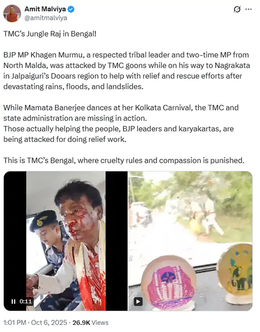 भाजपा विधायक घोष ने अस्पताल ले जाते समय एक वीडियो सोशल मीडिया पर साझा किया, जिसमें मुर्मू खून से लथपथ दिखाई दे रहे हैं और वाहन में तोड़फोड़ हुई थी। रिपोर्ट के अनुसार, दोनों नेता पिछले दो दिनों से बाढ़ प्रभावित क्षेत्रों का निरीक्षण और राहत वितरण के लिए दौरे पर थे।