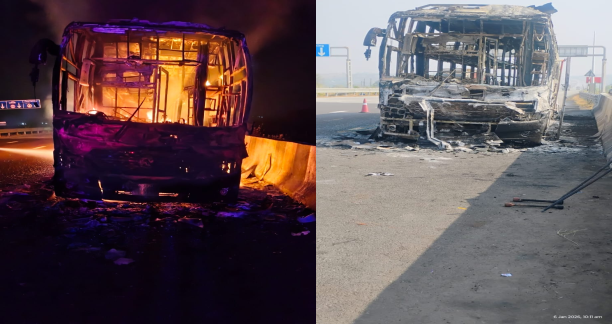 सभी यात्री सुरक्षित, कुछ घायल, बस जलकर खाक, जांच जारी