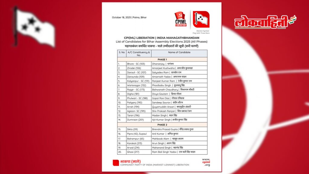 पटना। बिहार विधानसभा चुनाव 2025 के लिए भाकपा (माले) लिबरेशन ने शनिवार को 20 उम्मीदवारों की पहली सूची जारी की। पार्टी ने अपने सभी 12 मौजूदा विधायकों को पुनः टिकट देकर यह संदेश दिया कि संगठन अपनी जमीनी पकड़ और पहचान बनाए रखना चाहता है।