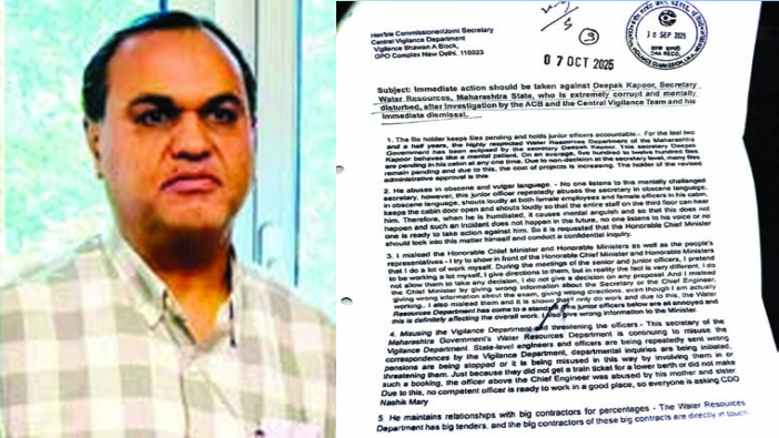 मुंबई। महाराष्ट्र के जल संसाधन विभाग के अतिरिक्त मुख्य सचिव दीपक कपूर के कथित कदाचार को लेकर केंद्रीय सतर्कता आयोग और केंद्रीय आपराधिक जाँच विभाग की ओर से राज्य के मुख्य सचिव को शिकायत भेजी गई है। इस संबंध में दैनिक लोकवाहिनी ने मंगलवार के अंक में खबर प्रकाशित की थी। इस शिकायत में कपूर के दुर्व्यवहार को लेकर गंभीर आरोप हैं और शिकायत के मुद्दों को देखते हुए अगर केंद्रीय सतर्कता आयोग और केंद्रीय अपराध जाँच विभाग द्वारा शिकायत की गहन जाँच की जाए, तो दूध का दूध और पानी का पानी हो जाएगा।