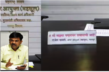 लोकवाहिनी, संवाददाता:नागपुर। यह भी खुलेआम कहा जाता है कि सरकारी विभाग में कोई भी काम बिना समय और रुपये दिये नहीं होता। लेकिन सभी सरकारी अधिकारी और कर्मचारी ऐसे नहीं हैं। वे अपना काम ईमानदारी से कर रहे हैं। ऐसे ही एक अधिकारी की नेमप्लेट सरकारी विभाग में चर्चा का विषय बनी हुई है। यह अधिकारी हैं संभागीय आयुक्त कार्यालय में राजस्व अतिरिक्त आयुक्त राजेश खवले। उन्होंने अपनी नेमप्लेट पर ‘मैं अपनी सेलरी से संतुष्ट हूं’ लिखा है।